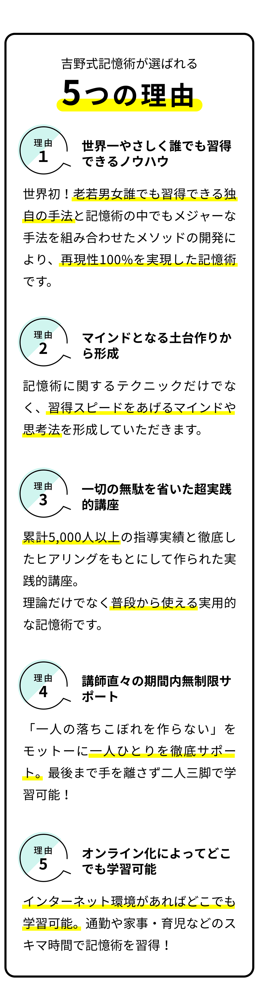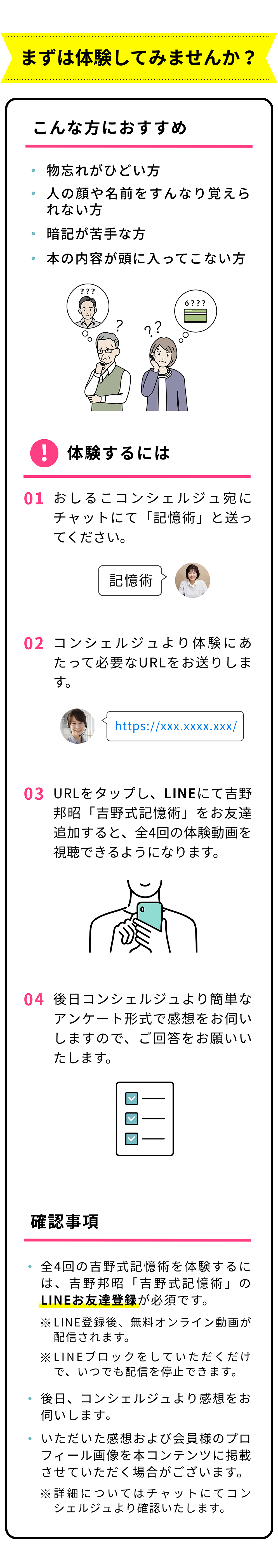 丁寧な説明でわかりやすかった。加齢が進む中での「記録から記憶」ができる習慣化の手段として、65歳以降の方も取り組むことができるコンテンツを期待しています。 できるかわからないけど、まずやってみることが大事なのだろうなと思いました。 韓ドラが大好きなので、楽しみながら挑戦してみたいと思います! 気づいたら動画を観終わっているくらいみやすく、知識をつけることが出来たと思います。これからは、自信を持ちながら記憶力を付けるように日々心掛けたいとおもいました。 自分でもやってみようと思える内容でした。英語を勉強したいと思っている人はたくさんいると思う。そういう人たちと集まって、記憶術と合わせて英語が勉強できれば嬉しい。 吉野先生の教え方がとってもユニークでわかりやすかった。難しそうだったけど、吉野先生の教え方がとっても分かりやすく楽しくレッスン受けられました。 50代でも記憶力は上がる!諦める前に取り組みたいトレーニングと習慣 【当てはまってる?】記憶力がいい人の特徴と性格 | 悪い人の特徴も